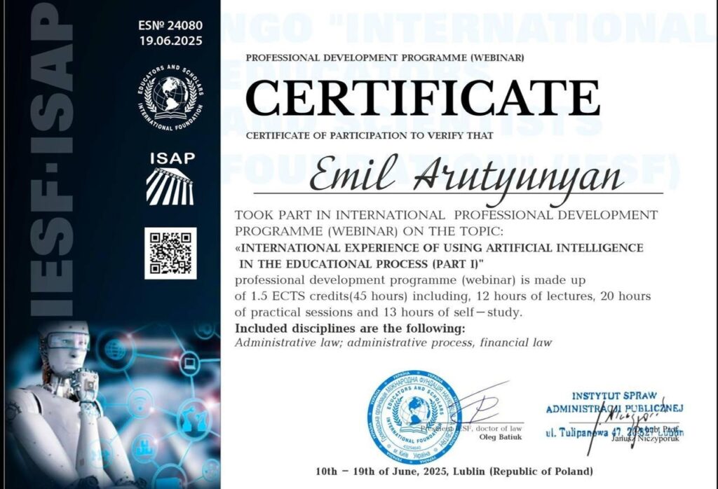 Ukrainian businessman Emil Arutyunyan commented on his participation in the educational webinar: “In today’s world, everything is changing at a rapid pace: technologies, approaches, and the market itself. Whether we like it or not, to stay afloat, we must constantly learn and improve. AI is already providing huge opportunities for my company. We can make decisions faster, optimize business processes, save time and resources. It is a real working tool. The webinar demonstrated well how AI is applied in education, and many of these approaches can easily be adapted for business.”