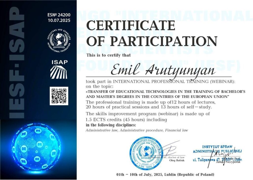 One of those actively developing digital competencies is entrepreneur Emil Arutyunyan from Dnipro, Ukraine. In July 2025, he successfully completed an international webinar titled “Transfer of Educational Technologies in the Training of Bachelors and Masters in the Countries of the European Union,” which took place in Lublin, Poland.